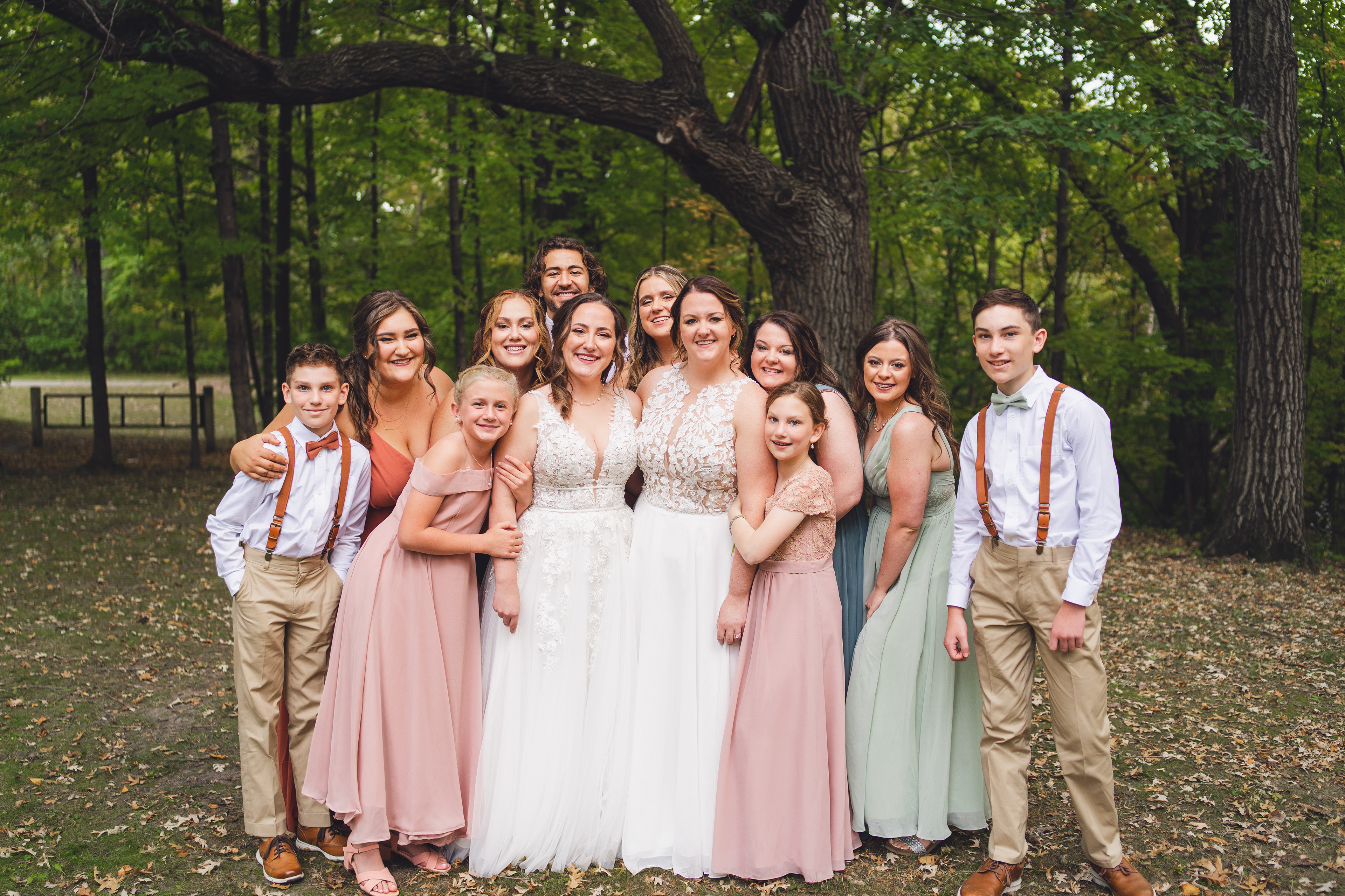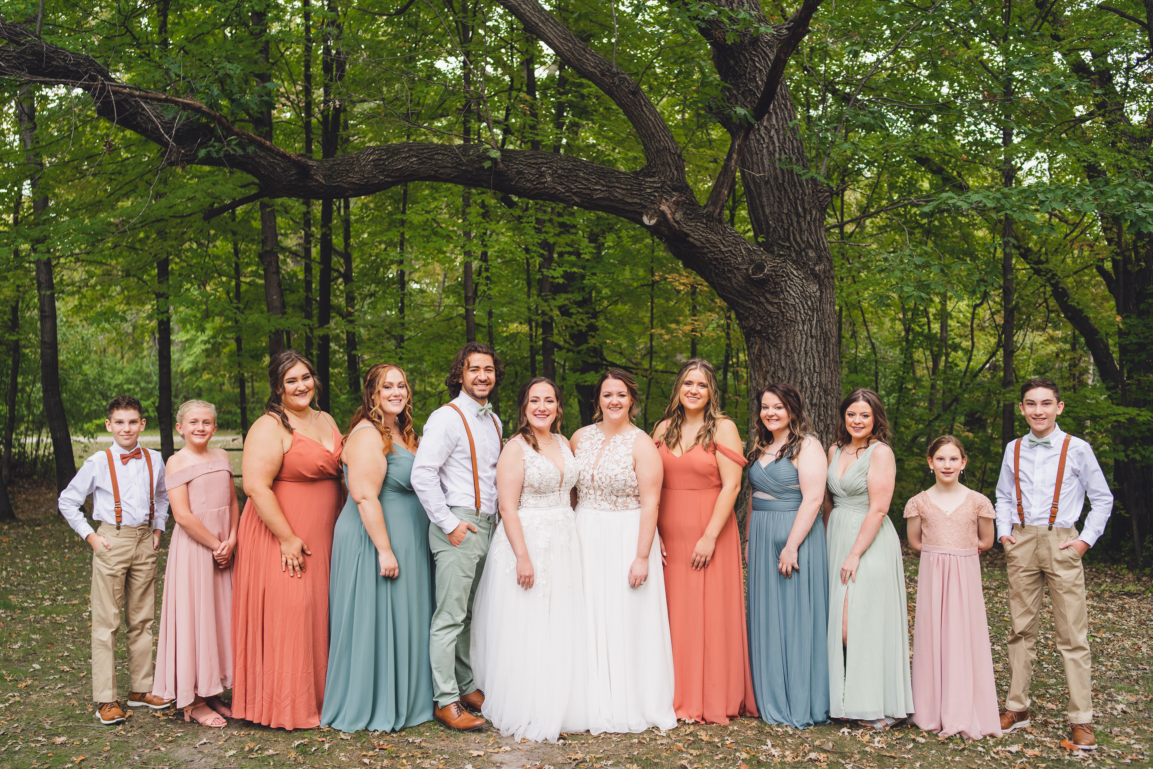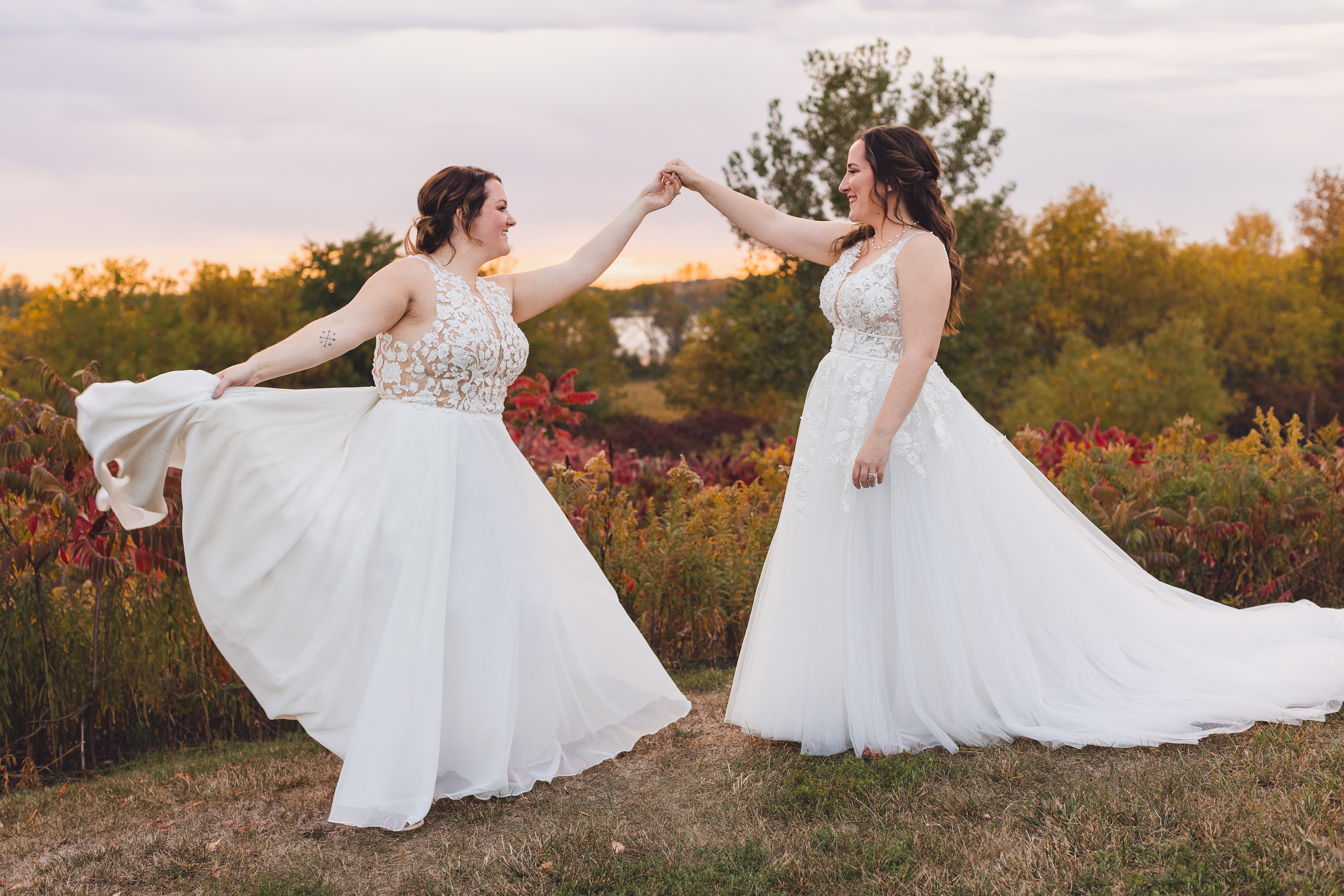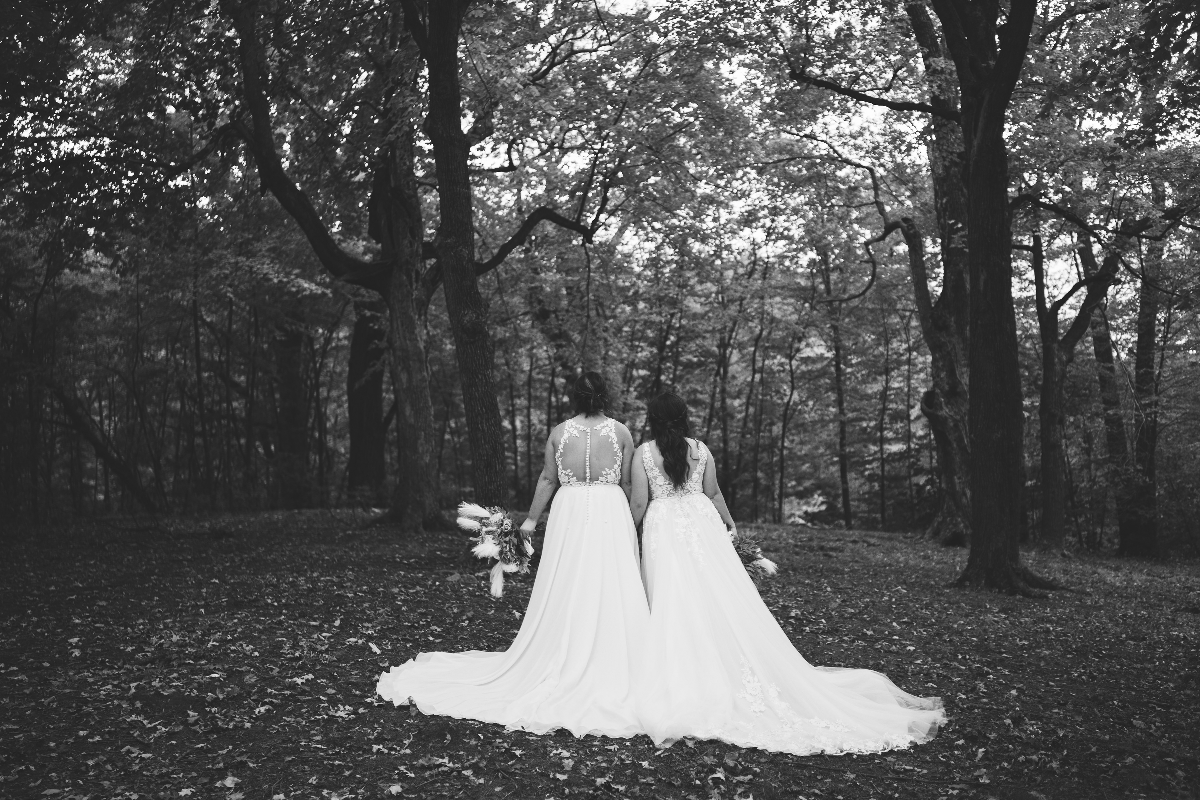 Emma and Kenzie's bougie wedding was hosted at Pique Travel, a new event space in downtown Excelsior, MN. We went to a nearby park I scouted for formal photos as it was an autumn wedding, and those colors are my jam! This wedding had two brides and they had beautiful flowers and dresses to complete their dream look for their wedding day.